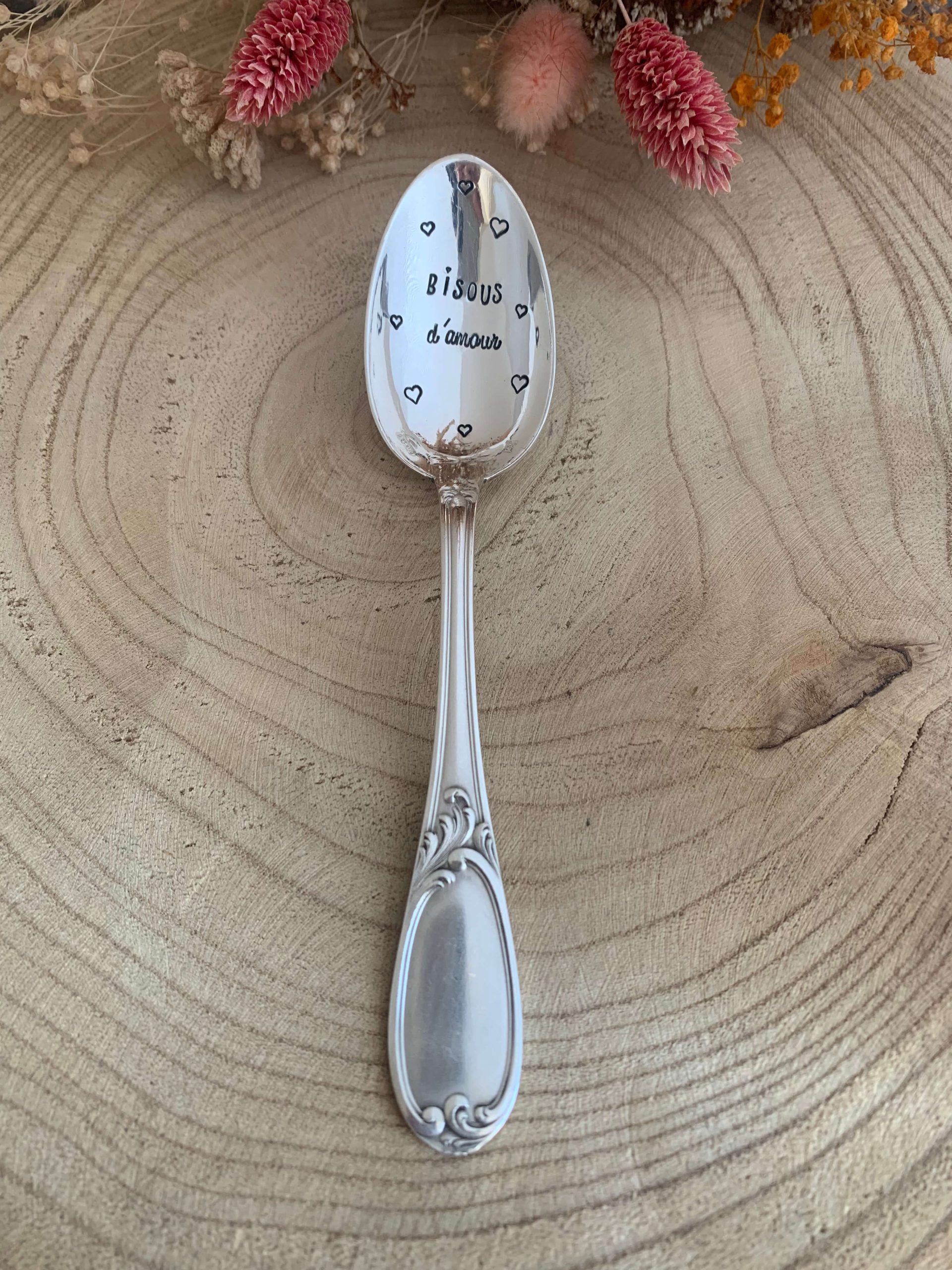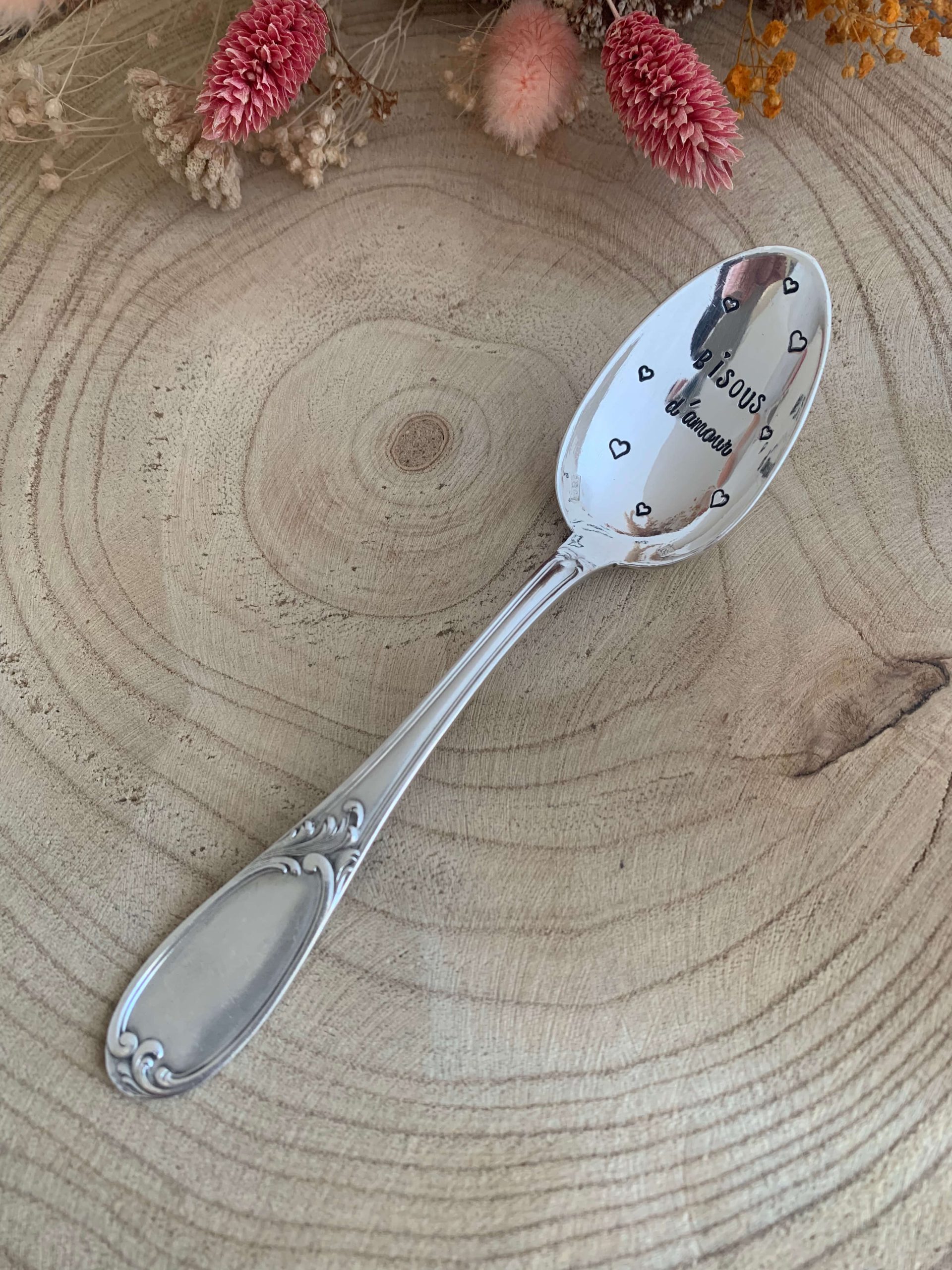 Je grave chaque cuillère personnalisée à la main, lettre par lettre, ce qui rend chaque pièce unique. Ainsi, de légères variations peuvent apparaître dans le marquage : elles sont la signature du travail artisanal et participent au charme de votre cuillère gravée.