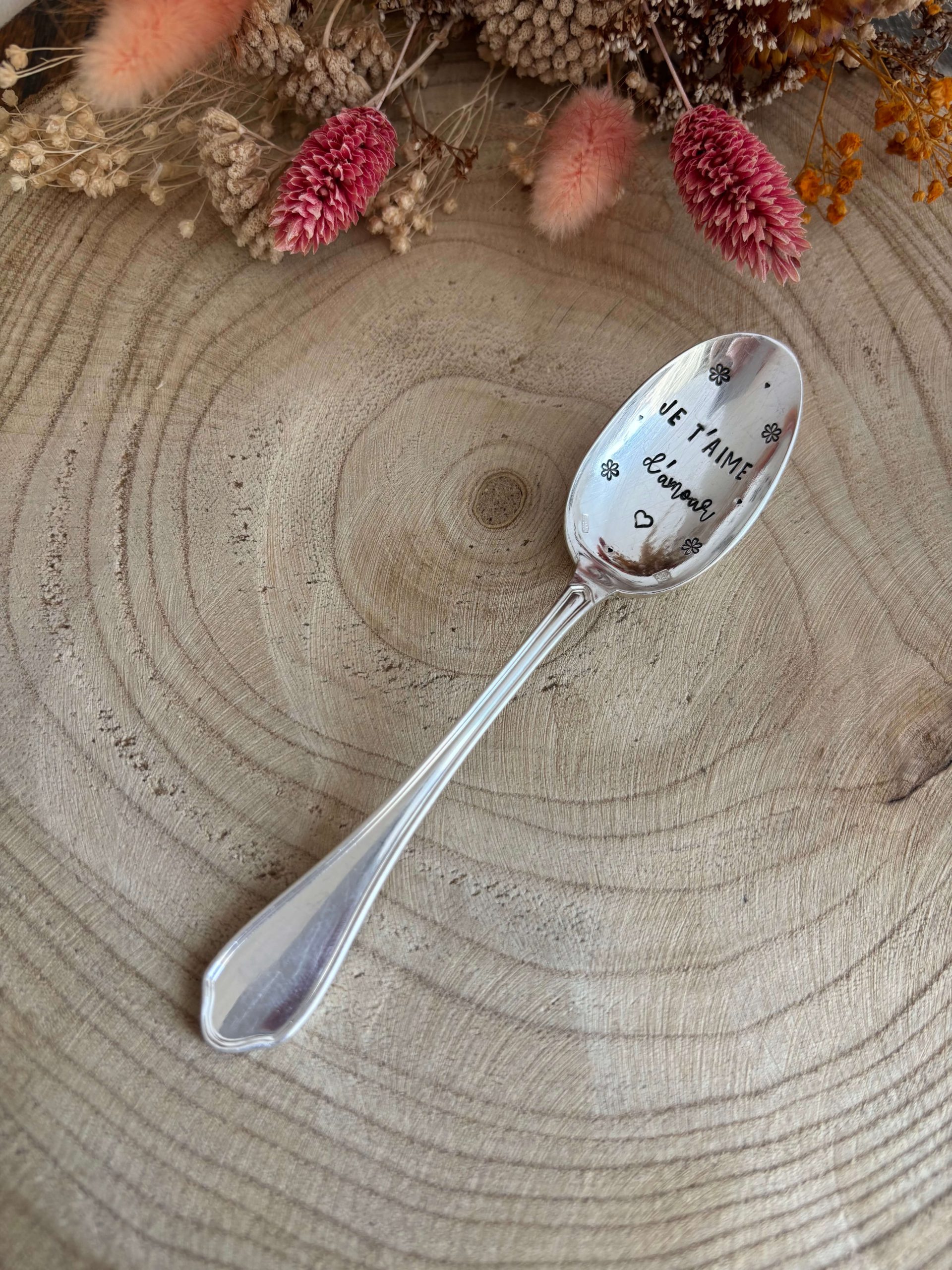 Je grave chaque cuillère personnalisée à la main, lettre par lettre, ce qui rend chaque pièce unique. Ainsi, de légères variations peuvent apparaître dans le marquage : elles sont la signature du travail artisanal et participent au charme de votre cuillère gravée.
