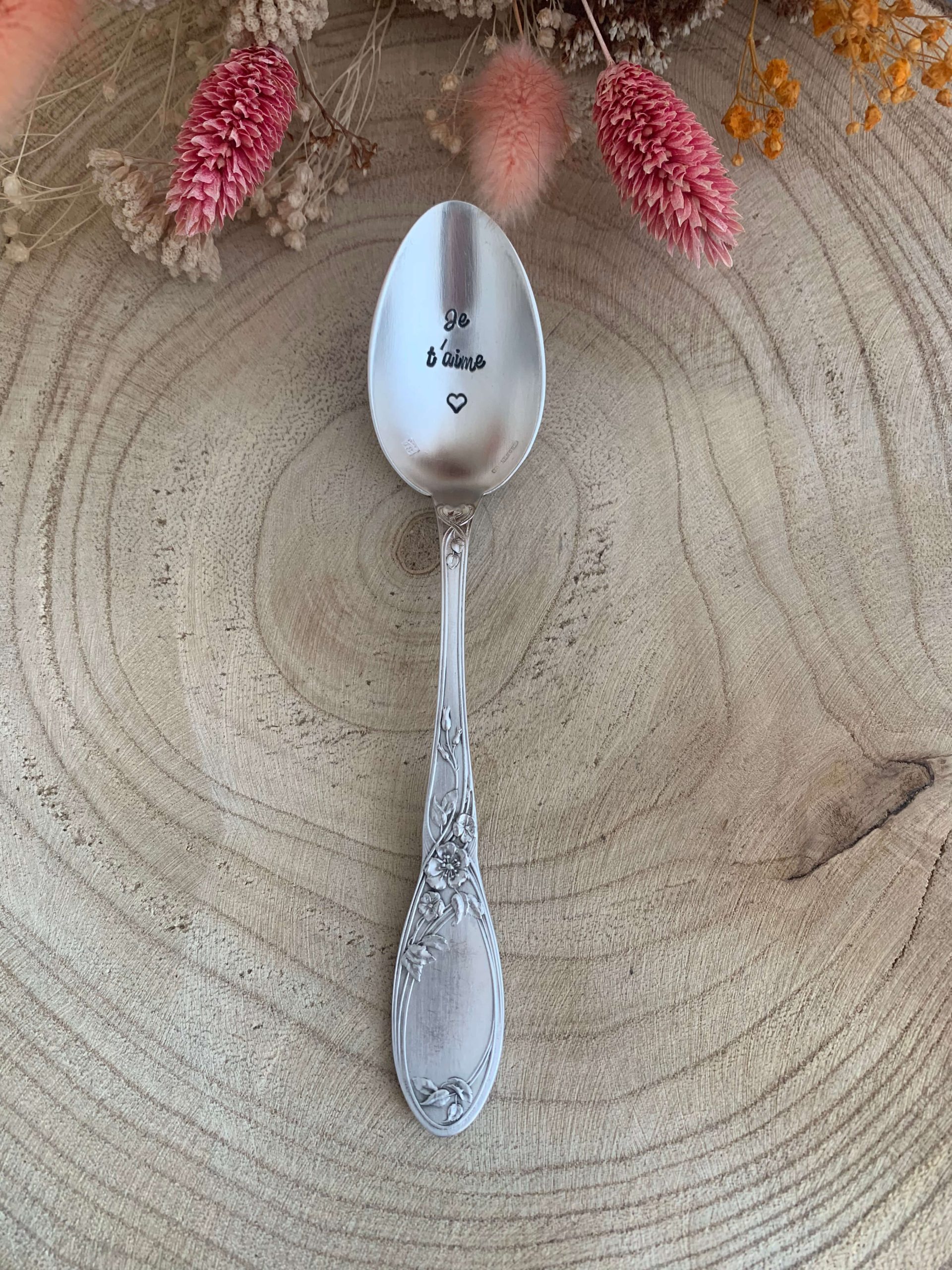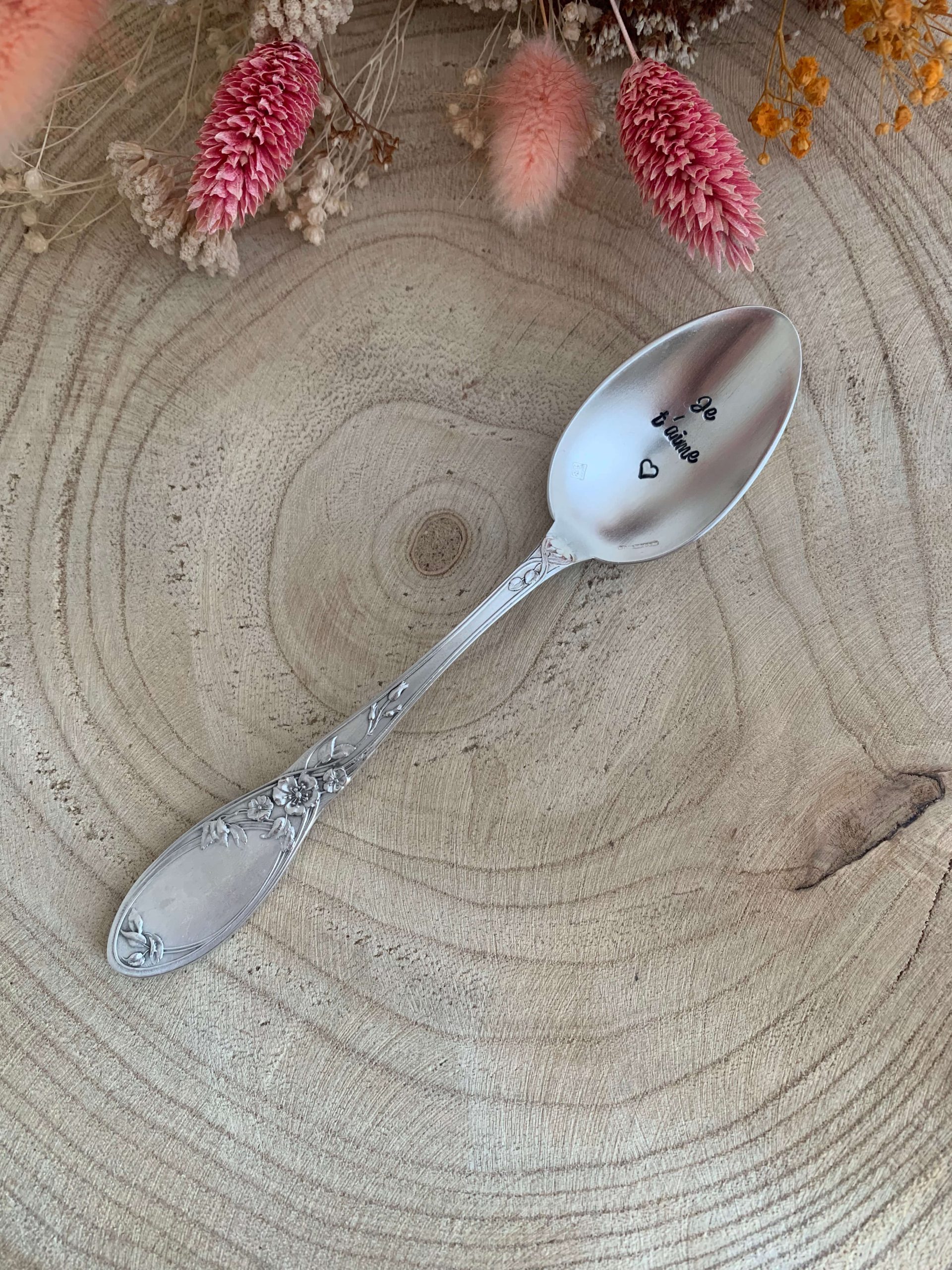 Je grave chaque cuillère personnalisée à la main, lettre par lettre, ce qui rend chaque pièce unique. Ainsi, de légères variations peuvent apparaître dans le marquage : elles sont la signature du travail artisanal et participent au charme de votre cuillère gravée.